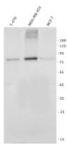 Western blot: T-47D, MDA-MB-453, and MCF-7 stained with ARG45198 Anti-Grainyhead-like protein 1 homolog antibody at 0.5 μg/ml dilution.