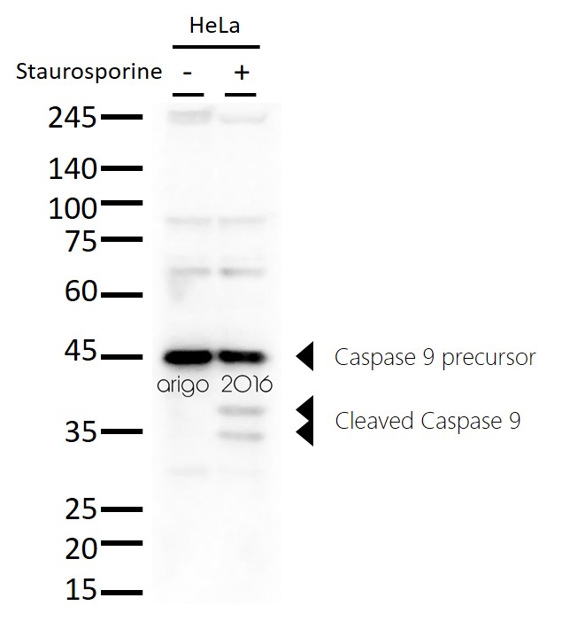 Western blot: 20 µg of HeLa untreated or treated with ARG54155 anti-Caspase 9 antibody at 1:1000 dilution.