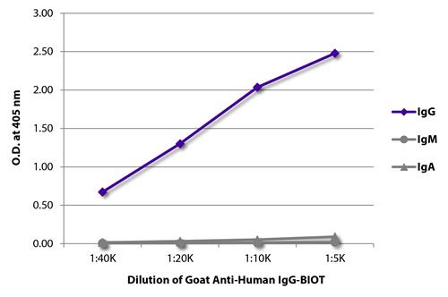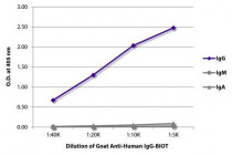ELISA: The plate was coated with purified Human IgG, IgM, and IgA. Immunoglobulins were detected with serially diluted ARG21905 Goat anti-Human IgG antibody (Biotin) (pre-adsorbed) followed by ARG23912 Streptavidin (HRP).