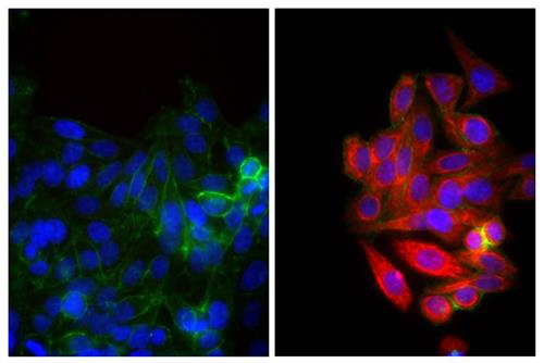 Immunofluorescence: Human epithelial carcinoma cell line HEp-2 stained with anti-Cytokeratin 18 antibody (right) and ARG22146 anti-CD44 antibody [F10-44-2] (FITC) followed by ARG21574 Goat anti-Mouse IgG2b antibody (Texas Red) (pre-adsorbed) and DAPI.