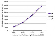 FLISA: The plate was coated with purified Mouse IgM, IgG and IgA. Immunoglobulins were detected with serially diluted ARG21519 Goat anti-Mouse IgM antibody (TRITC) (pre-adsorbed).