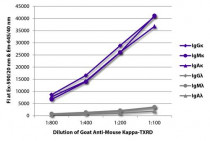 FLISA: The plate was coated with purified Mouse IgGκ, IgMκ, IgAκ, IgGλ, IgMλ and IgAλ. Immunoglobulins were detected with serially diluted ARG21552 Goat anti-Mouse Kappa Light Chain antibody (Texas Red) (pre-adsorbed).