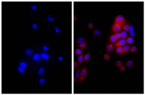 Immunofluorescence: Human pancreatic carcinoma cell line MIA PaCa-2 stained with anti-Cytokeratin 18 antibody (right) followed by ARG21552 Goat anti-Mouse Kappa Light Chain antibody (Texas Red) (pre-adsorbed) and DAPI.