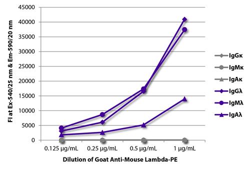 FLISA: The plate was coated with purified Mouse IgGκ, IgMκ, IgAκ, IgGλ, IgMλ and IgAλ. Immunoglobulins were detected with serially diluted ARG21562 Goat anti-Mouse Lambda Light Chain antibody (PE) (pre-adsorbed).