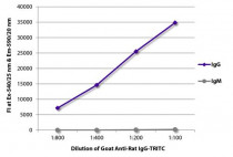 FLISA: The plate was coated with purified Rat IgG and IgM. Immunoglobulins were detected with serially diluted ARG21689 Goat anti-Rat IgG antibody (TRITC) (pre-adsorbed).