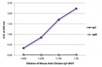 ELISA: The plate was coated with purified chicken IgY and IgM. Immunoglobulins were detected with serially diluted ARG21791 Mouse anti-Chicken IgY antibody [G-1] (Biotin) followed by ARG23912 Streptavidin (HRP).