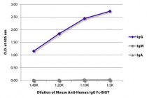 ELISA: The plate was coated with purified Human IgG, IgM, and IgA. Immunoglobulins were detected with serially diluted ARG21814 Mouse anti-Human IgG (Fc) antibody [JDC-10] (Biotin) followed by ARG23912 Streptavidin (HRP).
