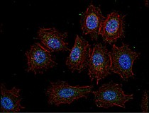 Immunofluorescence: A549 cell stained with ARG54712 anti-SRC antibody. A549 cells were fixed with 4% PFA (20 min), permeabilized with Triton X-100 (0.1%, 10 min), then incubated with SRC primary antibody (1:25, 1 h at 37°C). Cytoplasmic actin was counterstained with Alexa Fluor® 555 (red) conjugated Phalloidin (7units/ml, 1 h at 37°C). SRC immunoreactivity is localized to Cytoplasm significantly.