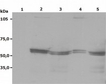 Western Blot: 1. Negative control, 2. RBL rat basophilic leukemia cell lysate, 3. Jurkat cell lysate, 4. A431 cell lysate, 5. U-937 cell lysate stained with antibody clone LYN-01