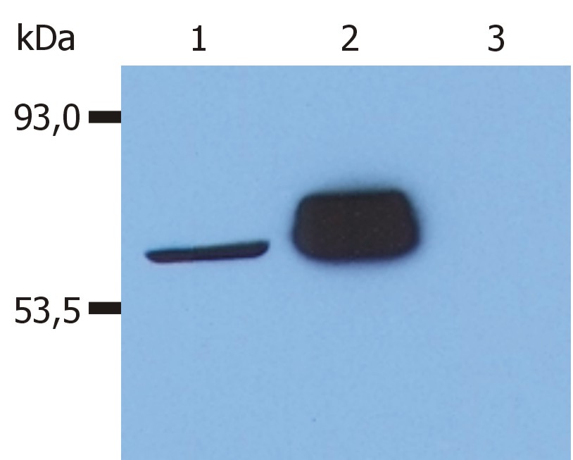 Western Blot: Lane 1: J. CaM-1.6 cell line (a mutant derivate of the JURKAT cell line) transfected with Lck; Lane 2: HEK-293T cell line transfected with Lck; Lane 3: HEK-293T cell line (non-transfected) stained with the monoclonal antibody clone LCK-01.