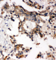 Immunohistochemistry: Paraffin-embedded Human lung cancer tissue. Antigen Retrieval: Heat mediation was performed in Citrate buffer (pH 6.0) for 20 min. The tissue section was blocked with 10% goat serum. The tissue section was then stained with ARG59210 anti-ABI1 / SSH3BP1 antibody at 1 µg/ml dilution, overnight at 4°C.
