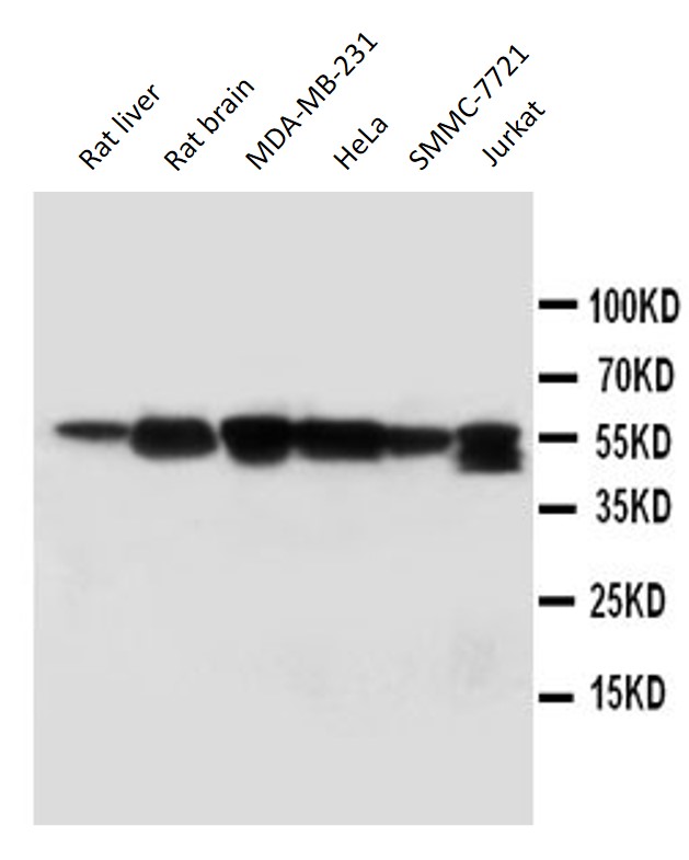 Western blot: Rat liver, Rat brain, MDA-MB-231, HeLa, SMMC-7721 and Jurkat lysates stained with ARG59210 anti-ABI1 / SSH3BP1 antibody.