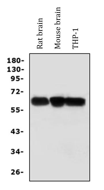 Western blot: 50 µg of sample under reducing conditions. Rat brain, Mouse brain and THP-1 whole cell lysates stained with ARG59210 anti-ABI1 / SSH3BP1 antibody at 0.5 µg/ml dilution, overnight at 4°C.