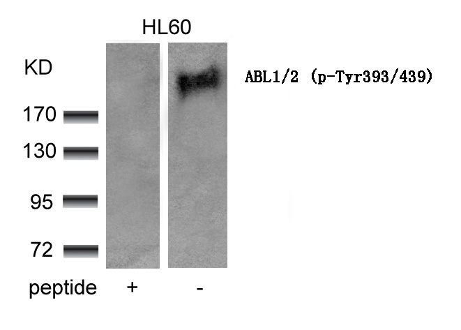 Western blot: Extracts from HL60 cells stained with ARG51820 anti-ABL1/2 phospho (Tyr393 / 439) antibody and the same antibody preincubated with blocking peptide.