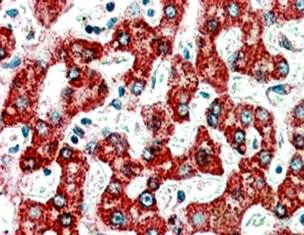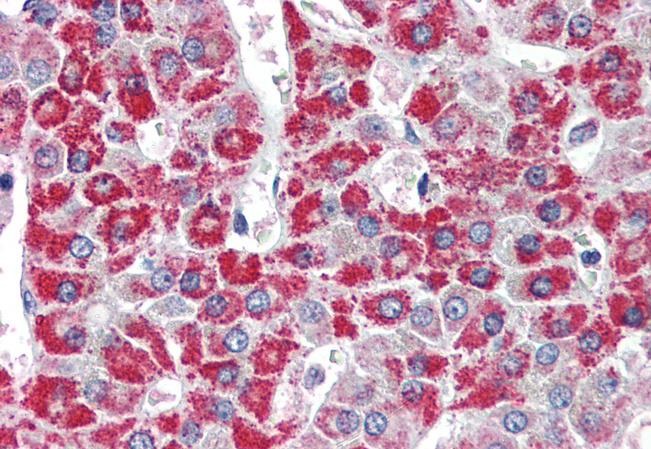 Immunohistochemistry: paraffin embedded Human Liver. (Steamed antigen retrieval with citrate buffer pH 6) stained with ARG63484 anti-ACADM antibody at 3.8 µg/ml dilution followed by AP-staining.