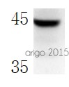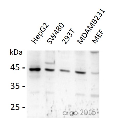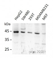 Western blot: 30 µg of 1) HepG2, 2) SW480, 3) 293T, 4) MDAMB231, and 5) MEF lysate stained with ARG54705 anti-ACAT1 antibody at 1:500 dilution.