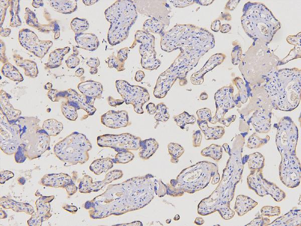 Immunohistochemistry: Paraffin-embedded Human placenta tissue. Antigen Retrieval: Heat mediation was performed in Citrate buffer (pH 6.0) for 20 min. The tissue section was blocked with 10% goat serum. The tissue section was then stained with ARG42695 anti-ACKR2 antibody at 1 µg/ml dilution, overnight at 4°C.
