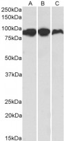 Western blot: Human (A), Mouse (B) and Rat (C) Adipose lysates (35 µg protein in RIPA buffer) stained with ARG65168 anti-ACO2 / Aconitase 2 antibody at 0.1 µg/ml dilution.