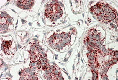 Immunohistochemistry: Paraffin-embedded Human breast. Antigen Retrieval: Steamed with Citrate buffer (pH 6.0). Tissue were stained with ARG65168 anti-ACO2 / Aconitase 2 antibody at 3.8 µg/ml dilution followed by AP-staining.