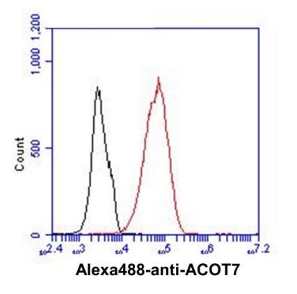 Flow Cytometry: 293T cell line stained with ARG57015 anti-ACOT7 antibody [1D5] at 2-5 µg for 1x10^6 cells (red line). Secondary antibody: Goat anti-Mouse IgG Alexa fluor 488 conjugate. Isotype control antibody was Mouse IgG (black line).