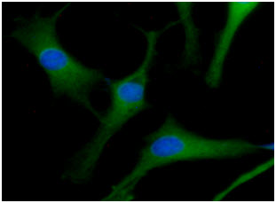 Immunoflorescense: U87MG cell line stained with ARG57015 anti-ACOT7 antibody [1D5] at 1:100 (Green).