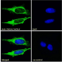 Immunofluorescence: Paraformaldehyde fixed HeLa cells permeabilized with 0.15% Triton. Cells were stained with ARG63483 anti-ACSL4 / FACL4 antibody (green) at 10 µg/ml dilution for 1 hour. DAPI (blue) for nuclear staining. Negative control: Unimmunized goat IgG (green) at 10 µg/ml dilution.