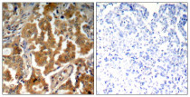 Immunohistochemistry: Paraffin-embedded Human lung carcinoma tissue stained with ARG51677 anti-ADD1 phospho (Ser726) antibody (left) or the same antibody preincubated with blocking peptide (right).