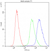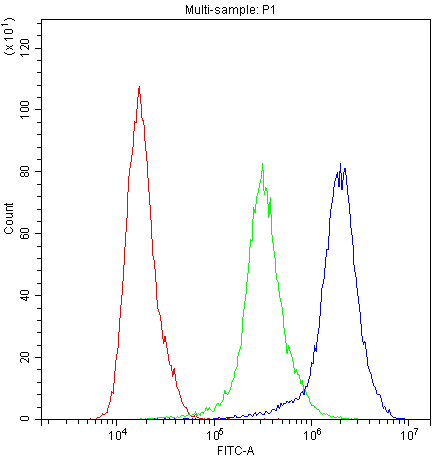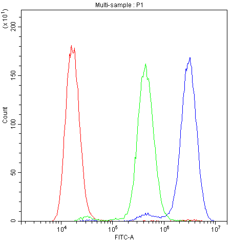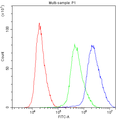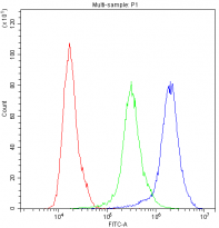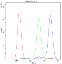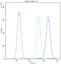 Flow Cytometry: HeLa cells were blocked with 10% normal goat serum and then stained with ARG59452 anti-ADO antibody (blue) at 1 µg/10^6 cells for 30 min at 20°C, followed by DyLight®488 labelled secondary antibody. Isotype control antibody (green) was rabbit IgG (1 µg/10^6 cells) used under the same conditions. Unlabelled sample (red) was also used as a control.