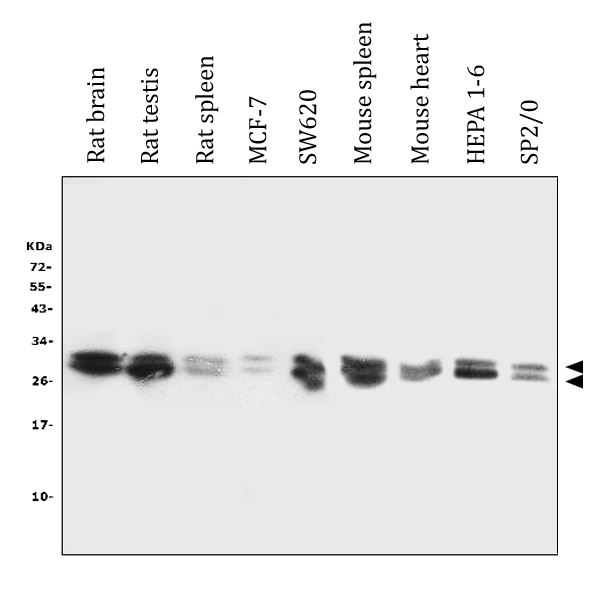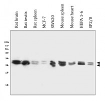 Western blot: 50 µg of sample under reducing conditions. Rat brain, Rat testis, Rat spleen, MCF-7, SW620, Mouse spleen, Mouse heart, HEPA1-6 and SP2/0 whole cell lysates stained with ARG59452 anti-ADO antibody at 0.5 µg/ml dilution, overnight at 4°C.