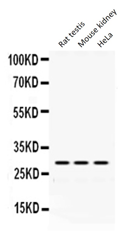 Western blot: Rat testis, Mouse kidney and HeLa whole cell lysates stained with ARG59452 anti-ADO antibody at 0.5 µg/ml dilution.