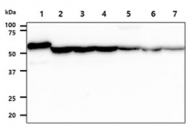 Western blot: 1) 20 ng of Recombinant Protein, 40 µg of 2) HeLa cell lysate, 3) 293T cell lysate, 4) Jurkat cell lysate, 5) HepG2 cell lysate, 6) A549 cell lysate, and 7) MCF7 cell lysate stained with ARG57062 anti-ADSL / Adenylosuccinate Lyase antibody [16C10] at 1:1000.