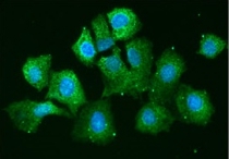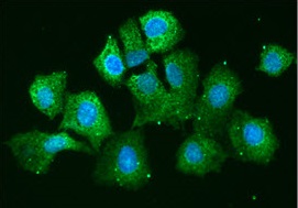 Immunofluorescence: Hep3B cells line stained with ARG57156 anti-AHA1 antibody [3E9] at 1:100 (Green).