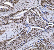 Immunohistochemistry: Human colorectal adenocarcinoma stained with ARG44409 anti-AHRR antibody at 2 μg/mL dilution.