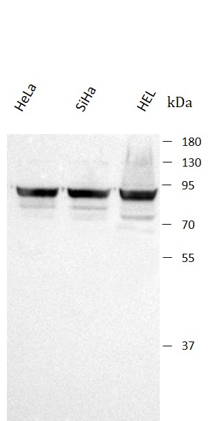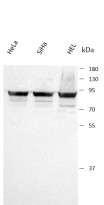 Western blot: HeLa, SiHa and HEL stained with ARG44409 anti-AHRR antibody at 0.5 μg/mL dilution.
