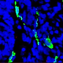 Immunohistochemistry: Frozen section of Mouse hippocampus tissue stained with ARG67006 anti-AIF1 / Iba 1 antibody (green) at 1:200 dilution. Nuclei are stained with DAPI (blue).