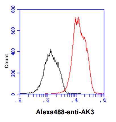 Flow Cytometry: Jurkat cell line stained with ARG56921 anti-AK3 antibody [SJB3-36] at 2-5 µg for 1x10^6 cells (red line). Secondary antibody: Goat anti-Mouse IgG Alexa fluor 488 conjugate. Isotype control antibody was Mouse IgG (black line).