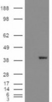 Western blot: 1). Mock transfection; 2) AKR1A1 (RC200302) expressing plasmid transfected HEK293 cell lysate standed with ARG63468 anti-AKR1A1 / Aldehyde Reductase antibody