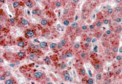 Immunohistochemistry: paraffin embedded Human Liver. (Steamed antigen retrieval with citrate buffer pH 6) stained with ARG63964 anti-AKR1C4 antibody at 2.5 µg/ml dilution followed by AP-staining.