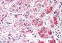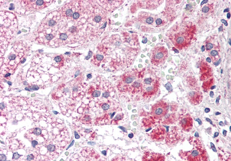 Immunohistochemistry: Paraffin-embedded Human adrenal gland tissue. Antigen Retrieval: Steam tissue section in Citrate buffer (pH 6.0). The tissue section was stained with ARG65265 anti-ALDH3A2 antibody at 5 µg/ml dilution followed by AP-staining.
