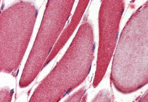 Immunohistochemistry: Paraffin-embedded Human skeletal muscle tissue. Antigen Retrieval: Steam tissue section in Citrate buffer (pH 6.0). The tissue section was stained with ARG64808 anti-ALOX15 antibody at 2 µg/ml dilution followed by AP-staining.