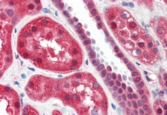 Immunohistochemistry: Paraffin-embedded Human kidney tissue. Antigen Retrieval: Steam tissue section in Citrate buffer (pH 6.0). The tissue section was stained with ARG64808 anti-ALOX15 antibody at 2 µg/ml dilution followed by AP-staining.