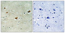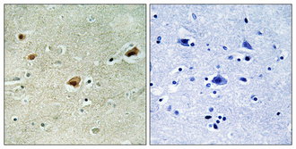 Immunohistochemistry: Paraffin-embedded Human brain tissue stained with ARG66604 anti-ARNT2 antibody at 1:100 dilution (4°C, overnight). Antigen Retrieval: High-pressure and temperature Tris-EDTA buffer (pH 8.0). Negative control (right) was pre-absorbed by immunogen peptide.