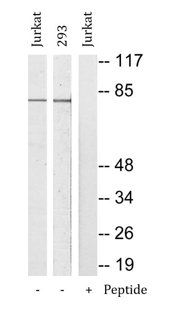 Western blot: Jurkat and 293 cell lysates stained with ARG66604 anti-ARNT2 antibody. The lane on the right was blocked with the synthetic peptide.