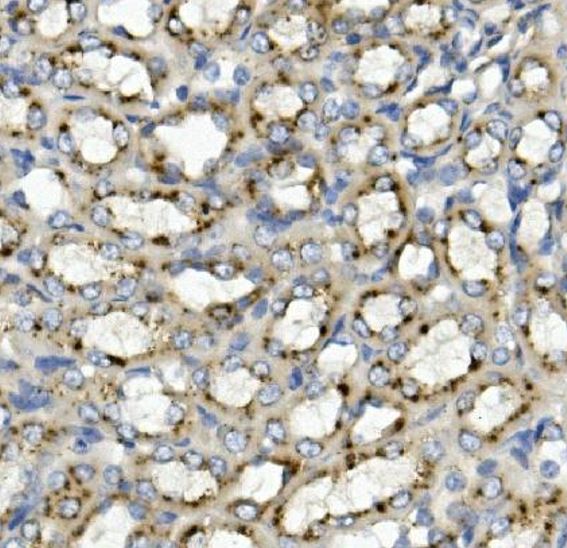 Immunohistochemistry: Mouse kidney stained with ARG45816 anti-ASAH1 antibody at 1 μg/ml dilution.
