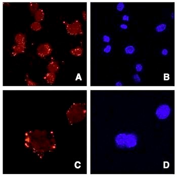 Immunofluorescence: ATDC5 cells (Panels A and C) and DAPI (panels B and D) stained with ARG63742 anti-ASPN / Asporin antibody. Data gratefuly received from Dr. Shiro Ikegawa, SNP Research Center, RIKEN, Japan.