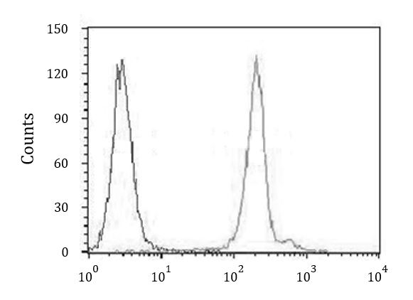 Flow Cytometry: HeLa cells stained with ARG54812 anti-ATG7 antibody (right histogram) or without primary antibody control (left histogram), followed by incubation with FITC labelled secondary antibody.