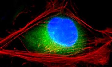 Immunofluorescence: 4% paraformaldehyde-fixed, 0.1% Triton X-100 permeabilized U-2 OS cells stained with ARG40147 anti-ATP6V1G3 antibody (green) at 1:25 dilution. Cytoplasmic actin is detected with Dylight® 554 Phalloidin at 1:100 dilution (red). DAPI (blue) for nuclear staining.