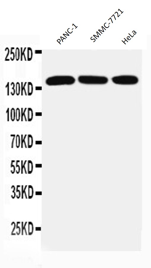Western blot: 50 µg of samples under reducing conditions. PANC-1, SMMC-7721, HeLa cell lysates stained with ARG59111 anti-ATX2 antibody at 0.5 μg/mL, overnight at 4°C.