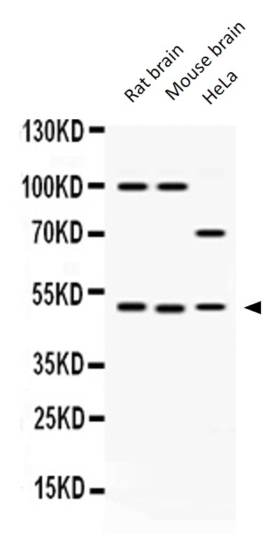 Western blot: Rat brain, Mouse brain and HeLa whole cell lysates stained with ARG59468 anti-AZIN2 antibody at 0.5 µg/ml dilution.