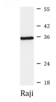 Western blot: 25 µg of Raji cell lysate stained with ARG42679 anti-Adenosine Receptor A1 antibody at 1:1000 dilution.